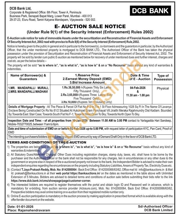 Details of Mortgage Property: All The Piece & Parcel Of Flat No F-2 In The 1 St Floor Admeasuring 1028 Sq Ft In The Name Of Lavanya Enclave Being Constructed On Rs No 81/2 Situated At Hukumpet Gram Panchayat Vill: Jiraithi Meraka Rajahmundry Dist Kadiam. Bounded By: Towards East: Stair Case; Towards South: Flat No F-1; Towards West: Open To Sky; Towards North: Open To Sky.