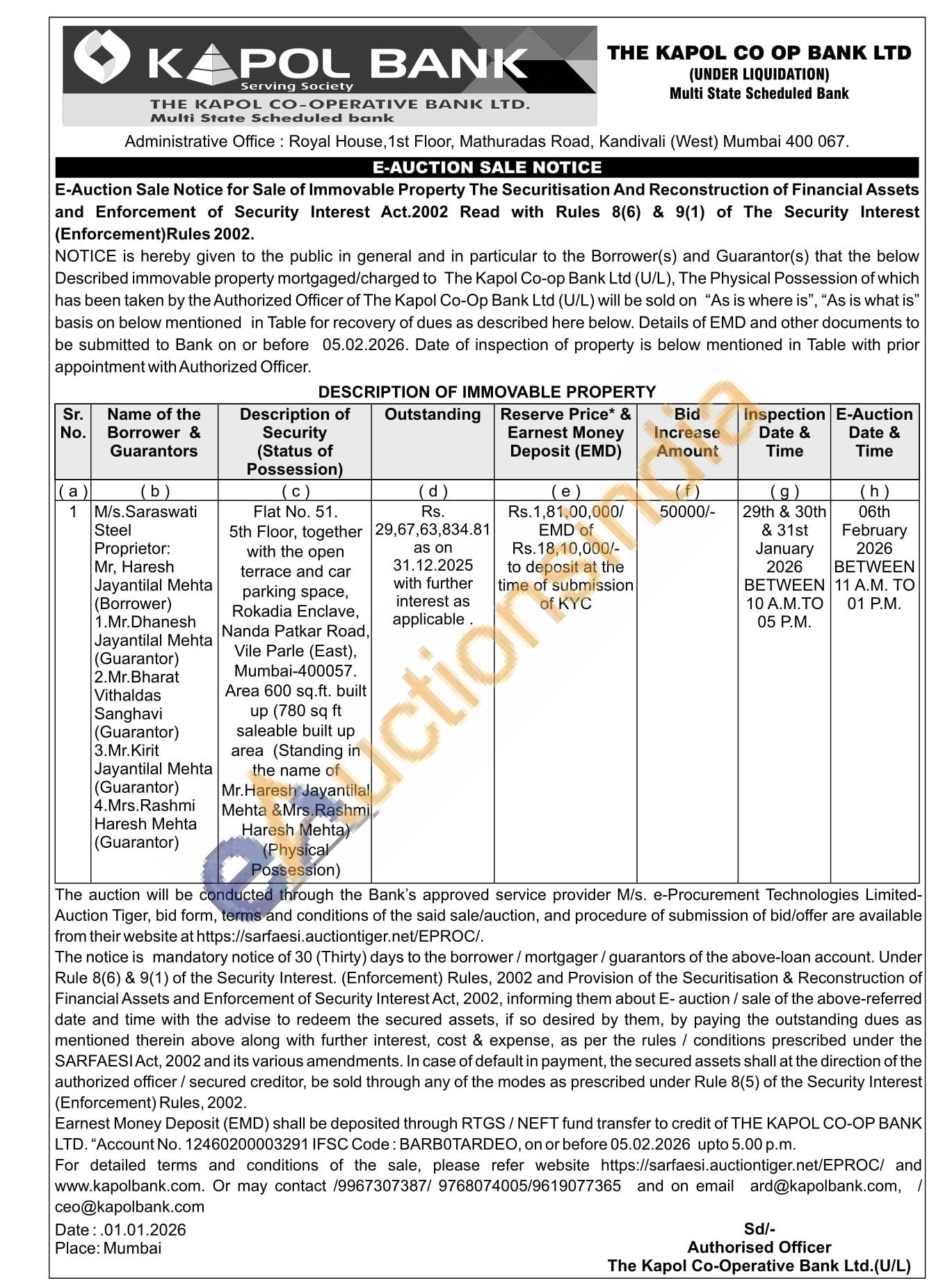 Flat No. 51. 5th Floor, together with the open terrace and car parking space, Rokadia Enclave, Nanda Patkar Road, Vile Parle (East), Mumbai-400057.Area 600 sq.ft. built up (780 sq ft saleable built up area