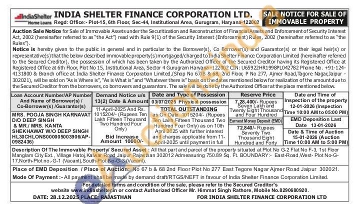 Description Of The Immovable Property/ Secured Asset: All that part and parcel of the property situated at Plot No G-2 Flat No F-3, 1st Floor Manglam City Ext., Village Hatoj, Kalwar Road Jaipur Rajasthan 302012 Admeasuring 750.89 Sq. Ft. BOUNDARY:- East-Road, West-Plot No-G-17. North-Plot no.-G-1 (Vacant), South-Plot No-G-3 (Vacant)