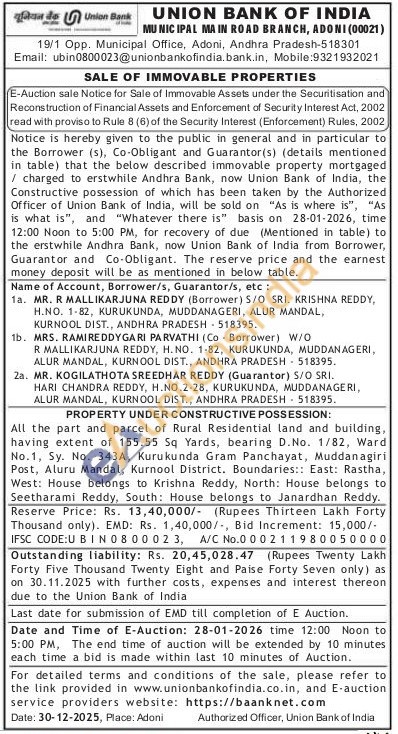 PROPERTY UNDER CONSTRUCTIVE POSSESSION: All the part and parcel of Rural Residential land and building, having extent of 155.55 Sq Yards, bearing D.No. 1/82, Ward No.1, Sy. No. 343A, Kurukunda Gram Panchayat, Muddanagiri Post, Aluru Mandal, Kurnool District. Boundaries:: East: Rastha, West: House belongs to Krishna Reddy, North: House belongs to Seetharami Reddy, South: House belongs to Janardhan Reddy