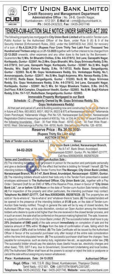 All that part and parcel of Land & Building existing now and construction to be put up there on in future at D. Nos. 683,683/3, 683/1, 682/1A, 682/2 & 670 at Narasaraopet Mandal, Yellamanda Gram Panchayat, Yallamanda Village, Plot No 125, Narasaraopet Sub-District, Narasaraopet Registration District measuring an extent of 400 Sq. Yds or 334.44 Sq. Mts. of Vacant Site with in the foliowing boundaries, East 30 Feet Wide Road-6000, South: 40 Feet Wide Road-6000, West Site belongs to Plot No. 104-6000, North: Site belongs to Plot No. 126-00:00.