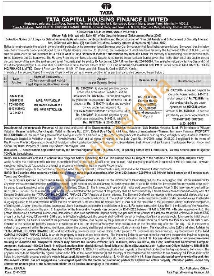 Description of the Immovable Property: All that piece and parcel of the Kramanumber: 1; District: Malappuram: Sub District: Melatoor, Taluk: Perinthalmanına, Village: Vettathur, Desam: Vettathur, Panchayath: Vettathur, Survey No.: 221/1, Extent (Are/Sqm): 4.84 Ares; Nature of Avagasham Tharam: Janmam-Parambu. PROPERTY DESCRIPTION: All that piece and parcels of land having an extent of 4.84 Ares in Sy.No. 221/1 and together with residential building along with right of way situated in Vettathur Panchayath located in Vettathur village in Perinthalmanna Taluk and all rights mentioned in the Sale Deed No. 1549/2016 dated 26.05.2016 registered in the name of Mrs. Priyamol P in Sub-Registration District of Melatoor in the Registration District of Malappuram. Boundaries: East: Property of Sankaran & Thankappan, North: Property of Saidali Haji West: Property of Saidali Haji South: Panchayath Road