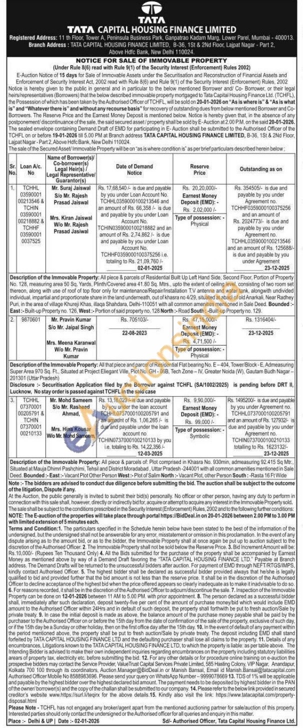 Description of the Immovable Property: All piece & parcels of: Plot comprised in Khasra No. 930min, admeasuring 92.415 Sq Mtr., Situated at Mauja Dhimri Pashchimi, Tehsil and District Moradabad, Uttar Pradesh-244001 with all common amenities mentioned in Sale Deed. Bounded:- East: Vacant Plot Other Person West:- Plot of Salim North:- Vacant Plot, other Person South:-Rasta 16 Ft Wide