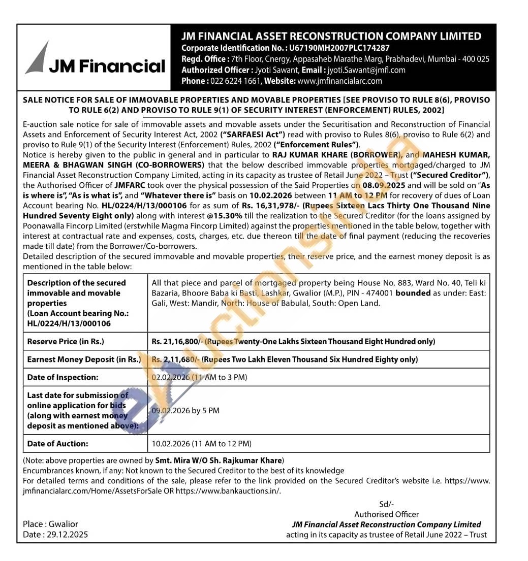 All that piece and parcel of mortgaged property being House No. 883, Ward No. 40, Teli ki Bazaria, Bhoore Baba ki Basti, Lashkar, Gwalior (M.P.), PIN-474001 bounded as under: East: Gali, West: Mandir, North: House of Babulal, South: Open Land