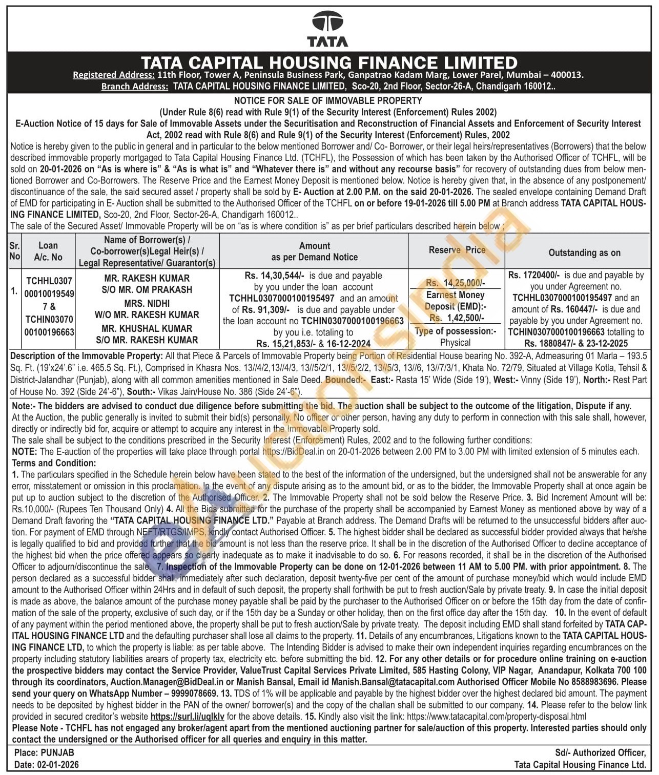 Description of the Immovable Property: All that Piece & Parcels of Immovable Property being Portion of Residential House bearing No. 392-A, Admeasuring 01 Marla-193.5 Sq. Ft. (19'x24.6" i.e. 465.5 Sq. Ft.), Comprised in Khasra Nos. 13//4/2,13//4/3, 13/5/2/1, 13/15/2/2, 13//5/3, 13//6, 13//7/3/1, Khata No. 72/79, Situated at Village Kotla, Tehsil & District-Jalandhar (Punjab), along with all common amenities mentioned in Sale Deed. Bounded:- East:- Rasta 15' Wide (Side 19'), West:- Vinny (Side 19'), North:- Rest Part of House No. 392 (Side 24'-6"), South:- Vikas Jain/House No. 386 (Side 24'-6")