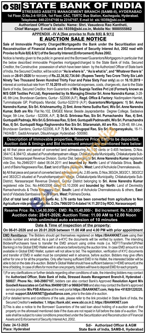 All that piece and parcel of converted land admeasuring Ac. 1.00 cents or 0.405 hectares, D.Nos. 384/1C & 384/10, situated at Purushottampatnam village, Chilakaluripeta Municipality, Chilakaluripeta Sub-District, Narasaraopet Revenue Division, Guntur Dist, belonging to Sri. Anne Narendra Kumar registered vide Doc. No.2946/2011 dated 06.04.2011 and bounded by: North: Land of Vidadala Shiva, South: Land of Baira Nageswara Rao, East: land of Baira Jayapathi, West: Land of Achukola Chennakesavulu. b) All that piece and parcel of converted land admeasuring Ac. 2.85 cents, D.Nos.383/2A,383/2C1, 383/2C2 and 383/2C3 situated at Purushottampatnam village, Chilakaluripeta Municipality, Chilakaluripeta Sub-District, Narasaraopet Revenue Division, Guntur District belonging to Sri. Anne Narendra Kumar registered vide Doc. No.4490/2006 dated 03.10.2006 and bounded by: North: Land of Devireddy Ramachandrudu & Thota Koteswara Rao, South: Land of Achukola Chennakesavulu & others, East: land of Vidadala Sambasiva Rao & others, West: Polimera Donka.