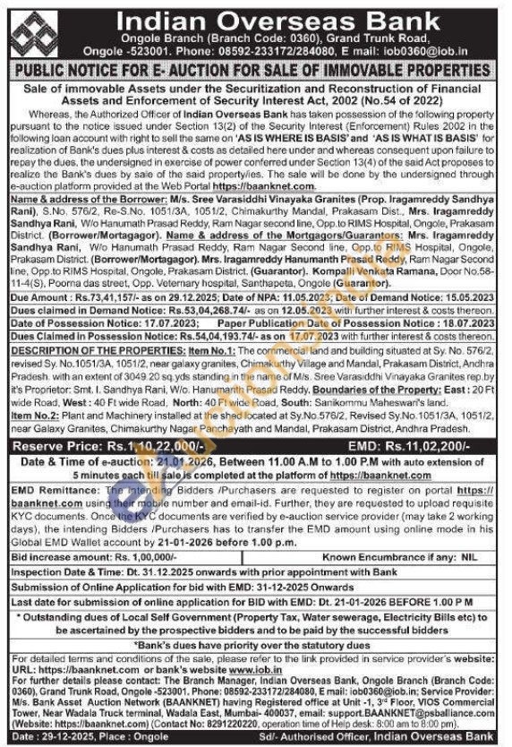 DESCRIPTION OF THE PROPERTIES: Itern No. 1: The commercial land and building situated at Sy. No. 576/2, revised Sy. No.1051/3A, 1051/2, near galaxy granites, Chimakurthy Village and Mandal, Prakasam District, Andhra Pradesh, with an extent of 3049. 20 sq. yds standing in the name of Mis. Sree Varasiddhi Vinayaka Granites rep.by it's Proprietor: Smt. I. Sandhya Rani, Wio. Hanumanth Prasad Reddy, Boundaries of the Property: East: 20 Ft wide Road, West: 40 Ft wide Road, North: 40 Fl wide Road, South: Sanikommu Maheswar's land. Item No.2: Plant and Machinery installed at the shed located at Sy.No. 576/2. Revised Sy.No. 1051/3A, 1051/2, near Galaxy Granites, Chimakurthy Nagar Panchayath and Mandal, Prakasam District, Andhra Pradesh.