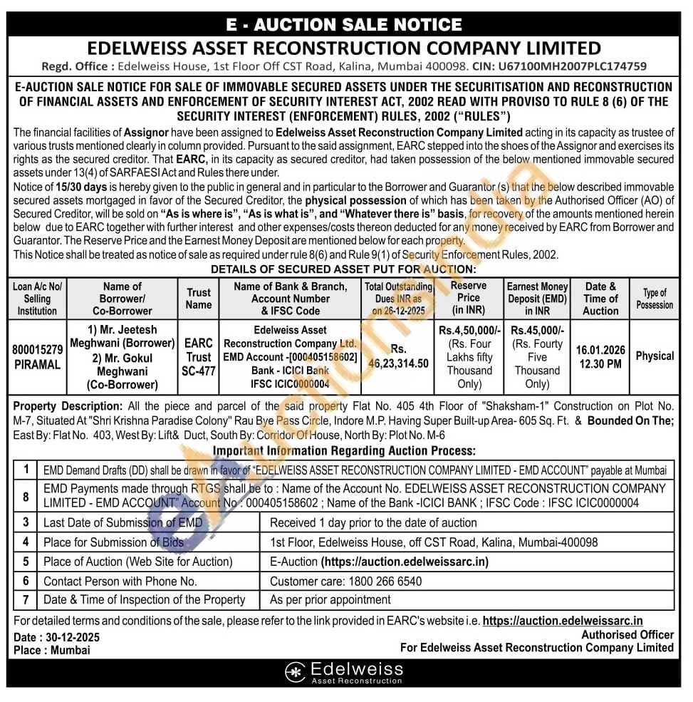 Property Description: All the piece and parcel of the said property Flat No. 405 4th Floor of "Shaksham-1" Construction on Plot No. M-7, Situated At "Shri Krishna Paradise Colony" Rau Bye Pass Circle, Indore M.P. Having Super Built-up Area-605 Sq. Ft. & Bounded On The; East By: Flat No. 403, West By: Lift& Duct, South By: Corridor Of House, North By: Plot No. M-6
