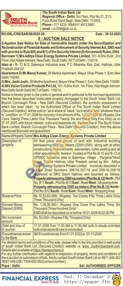 All that piece and parcel of land with Industrial building admeasuring 6500 sq. Meters (3200 plus 3300) along with all other constructions, improvements, easmentary rights existing and all other appurtenants thereon located at Plot No. B 12 and B 13 of UPSIDC Industrial area in Salempur Village, Pargana/Tehsil Sasni, District Hathras, Uttar Pradesh owned by M/s Aditya Clean Energy Systems Private Limited morefully described in Lease Deed Numbers 306/16,307/16 and 308/16,309/16 registered at SRO Sasni Hathras and bounded as follows; Property admeasuring 3200 sq. meters (Plot No.B.12) North: Plot No.B11 South: Plot No.B13 East: Road West: Shopping Area Property admeasuring 3300 sq.meters (Plot No.B.13) North: Plot No.B12 South: Road East: Road West: Shopping Area