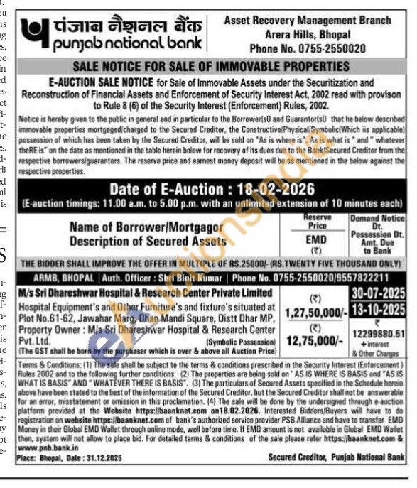 Hospital Equipment's and Other Furniture's and fixture's situated at Plot No.61-62, Jawahar Marg, Dhan Mandi Square, Distt Dhar MP, Property Owner: M/s Sri Dhareshwar Hospital & Research Center Pvt.Ltd