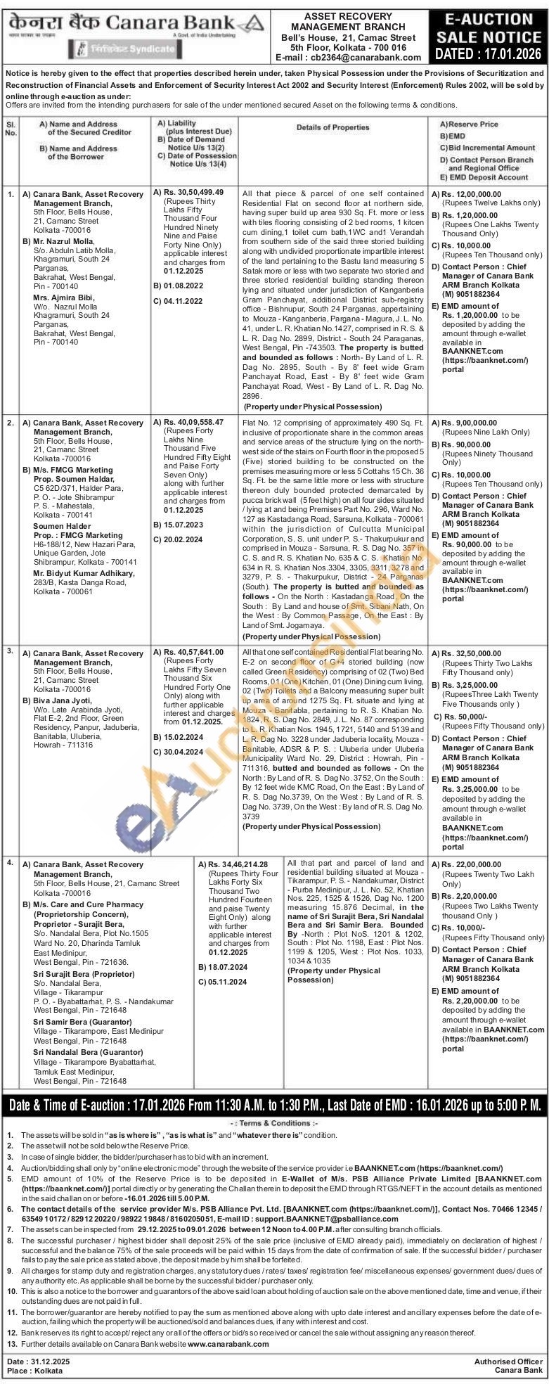 All that piece & parcel of one self contained Residential Flat on second floor at northern side, having super build up area 930 Sq. Ft. more or less with tiles flooring consisting of 2 bed rooms, 1 kitcen cum dining, 1 toilet cum bath, 1WC and1 Verandah from southern side of the said three storied building along with undivided proportionate impartible interest of the land pertaining to the Bastu land measuring 5 Satak more or less with two separate two storied and three storied residential building standing thereon lying and situated under jurisdiction of Kanganberia Gram Panchayat, additional District sub-registry office- Bishnupur, South 24 Parganas, appertaining to Mouza-Kanganberia, Pargana-Magura, J. L. No. 41, under L. R. Khatian No. 1427, comprised in R.S. & L. R. Dag No. 2899, District South 24 Paraganas, West Bengal, Pin-743503. The property is butted and bounded as follows: North- By Land of L. R. Dag No. 2895, South By 8 feet wide Gram Panchayat Road, East By 8' feet wide Gram Panchayat Road, West By Land of L. R. Dag No. 2896