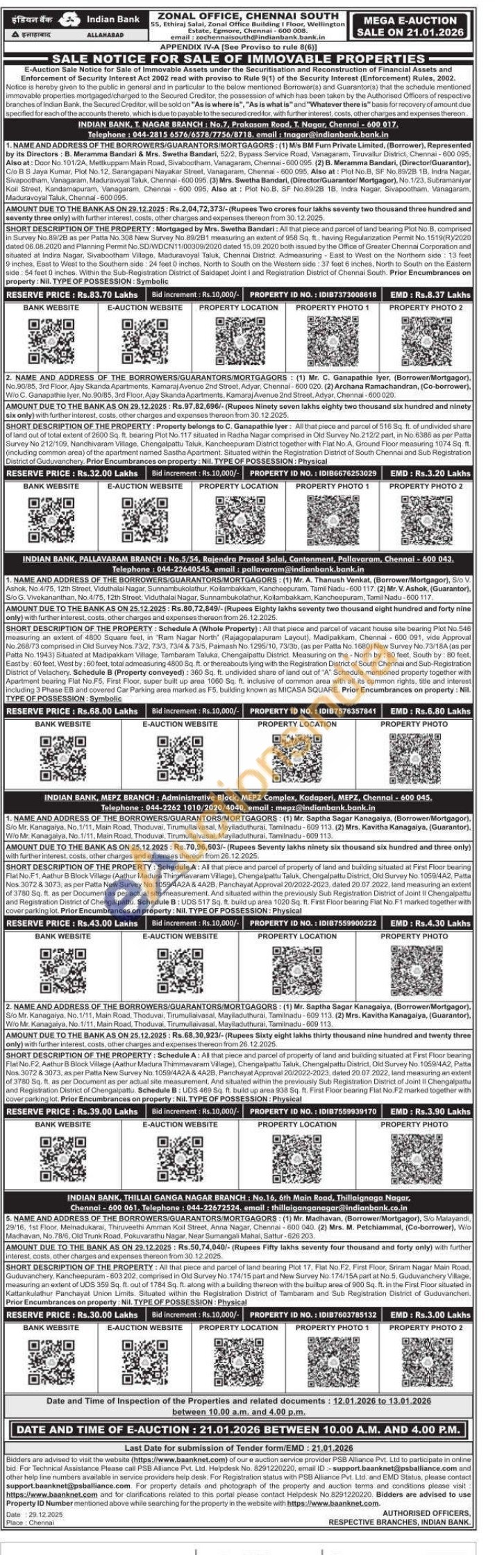 1) All that piece and parcel of land bearing Plot No.B. comprised in Survey No.89/28 as per Patta No.308 New Survey No. 89/281 measuring an extent of 958 Sq. ft., having Regularization Permit No. 1519(R)/2020 dated 06.08.2020 and Planning Permit No.SD/WDCN11/00309/2020 dated 15.09.2020 both issued by the Office of Greater Chennai Corporation and situated at Indira Nagar, Sivabootham Village, Maduravoyal Taluk, Chennai District. Admeasuring East to West on the Northern side 13 feet 9 inches, East to West to the Southern side: 24 feet 0 inches, North to South on the Western side: 37 feet 6 inches, North to South on the Eastern side: 54 feet 0 inches. Within the Sub-Registration District of Saidapet Joint I and Registration District of Chennai South. Prior Encumbrances on property: Nil. TYPE OF POSSESSION: Symbolic