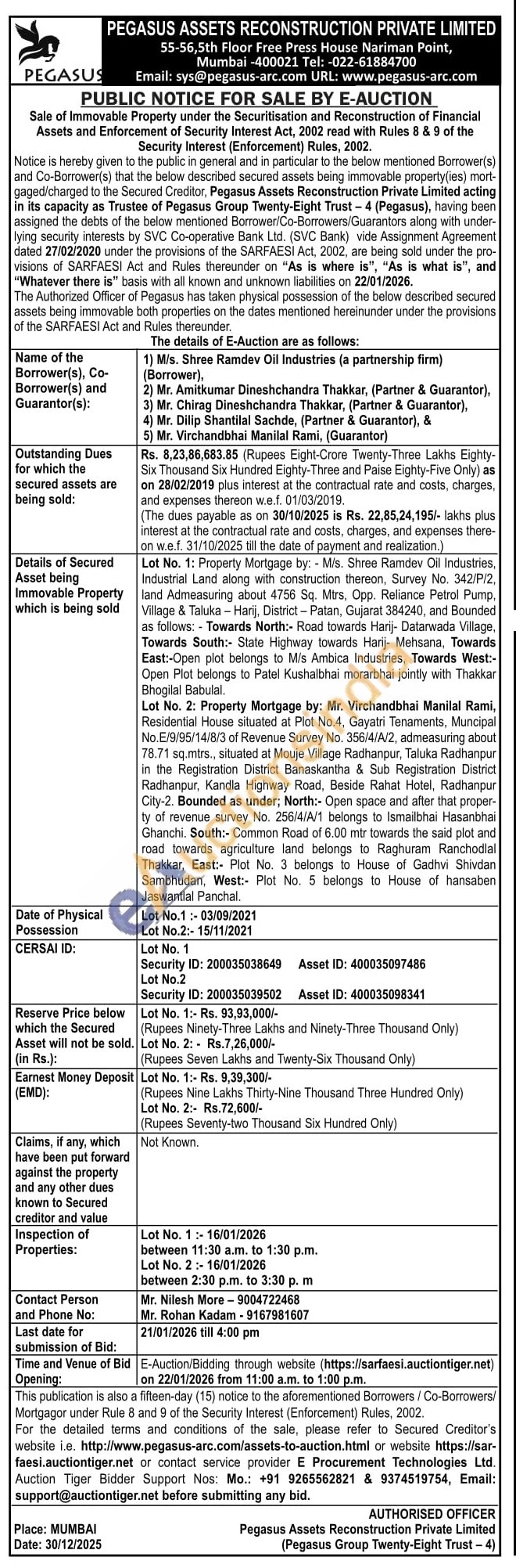 Property Mortgage by: Mr. Virchandbhai Manilal Rami, Residential House situated at Plot No.4, Gayatri Tenaments, Muncipal No.E/9/95/14/8/3 of Revenue Survey No. 356/4/A/2, admeasuring about 78.71 sq.mtrs., situated at Mouje Village Radhanpur, Taluka Radhanpur in the Registration District Banaskantha & Sub Registration District Radhanpur, Kandla Highway Road, Beside Rahat Hotel, Radhanpur City-2. Bounded as under; North: Open space and after that proper-ty of revenue survey No. 256/4/A/1 belongs to Ismailbhai Hasanbhai Ghanchi. South:- Common Road of 6.00 mtr towards the said plot and road towards agriculture land belongs to Raghuram Ranchodlal Thakkar, East: Plot No. 3 belongs to House of Gadhvi Shivdan Sambhudan, West: Plot No. 5 belongs to House of hansaben Jaswantlal Panchal.