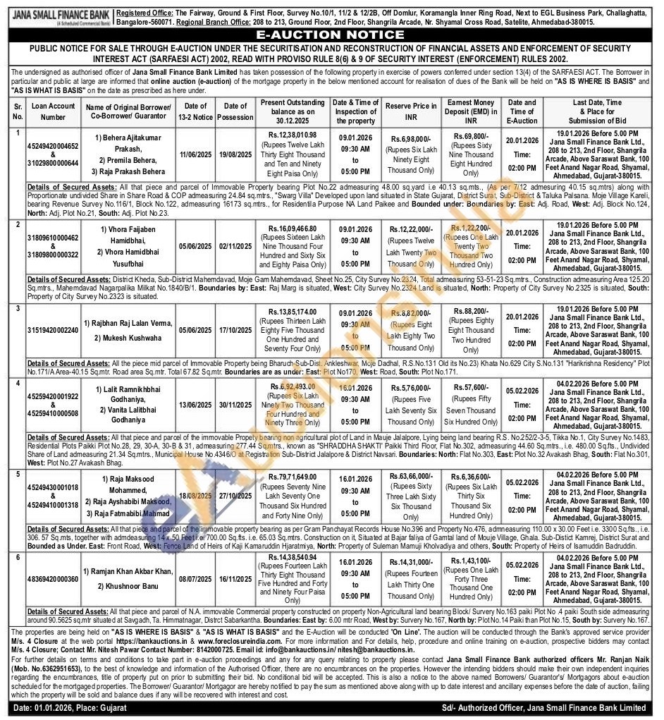 Details of Secured Assets: All that piece and parcel of N.A. immovable Commercial property constructed on property Non-Agricultural land bearing Block/ Survery No. 163 paiki Plot No 4 paiki South side admeasuring around 90.5625 sq.mtr situated at Savgadh, Ta. Himmatnagar, District Sabarkantha. Boundaries: East by: 6.00 mtr Road, West by: Survery No. 167, North by: Plot No. 14 Paiki than Plot No.15, South by: Survery No. 167.