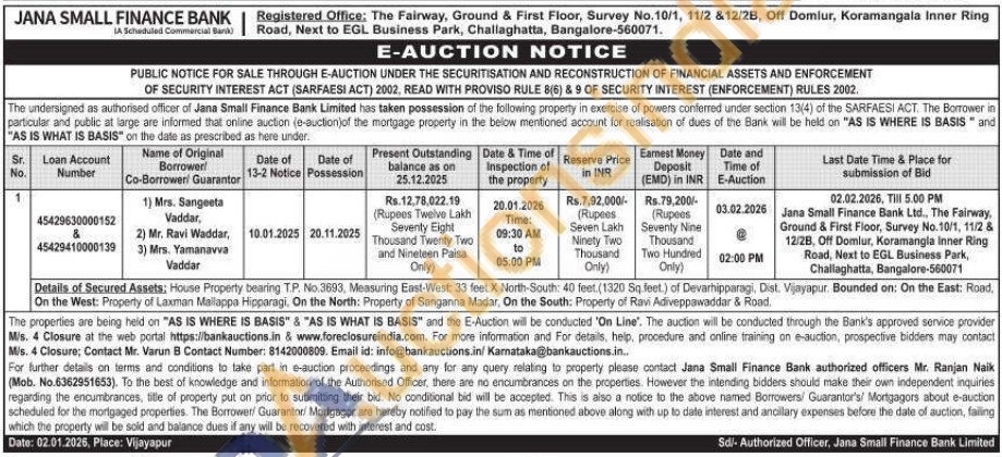 Details of Secured Assets: House Property bearing T.P. No.3693, Measuring East-West: 33 feet. X North-South: 40 feet. (1320 Sq.feet.) of Devarhipparagi, Dist. Vijayapur, Bounded on: On the East: Road, On the West: Property of Laxman Mailappa Hipparagi. On the North: Property of Sanganna Madar, On the South: Property of Ravi Adiveppawaddar & Road