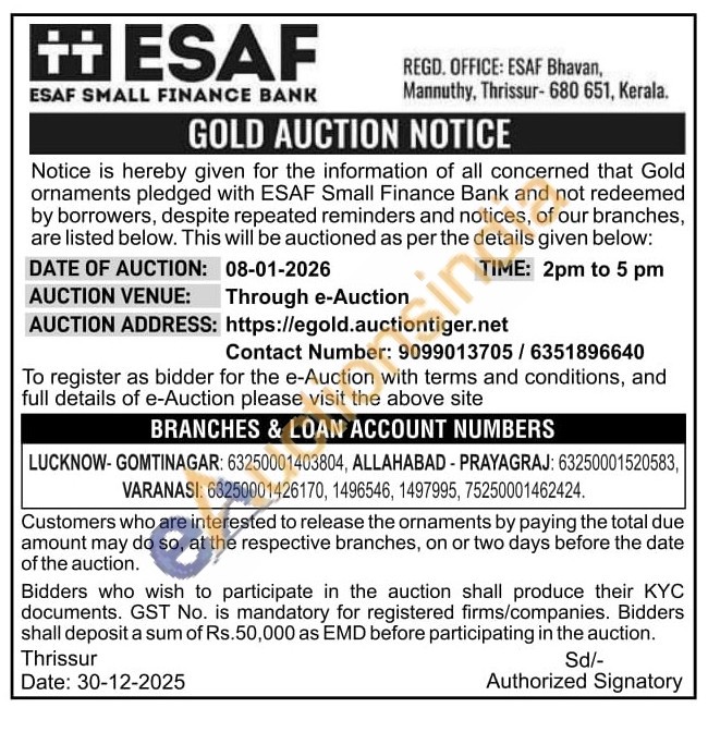 ESAF SMALL FINANCE BANK Gold Auctions Auction in Thrissur