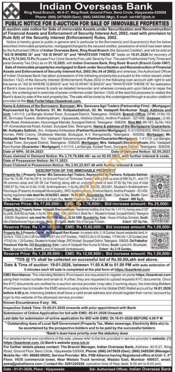 DESCRIPTION OF THE IMMOVABLE PROPERTY : Property No 2: Property Owner: Vadapalli Shesharattnam: Residential building of at Door No. 1-41/1/3, having area of 357 sq yards, Built 902 sq Feets, in Sy.No. 1064, 1065, 1066, Ward No.0, Block No. 1, Situated in Kodad, Suryapet District, Telangana -508206. Registered sale deed No.562/1999, dated: 22.04.1999. Bounded by: East: House of Kattoju Somalah, South: Site of Bellamkonda Rajya Lakshmi, West: 19.6 Bazar, North: Site of Sangoju Puliaiah.