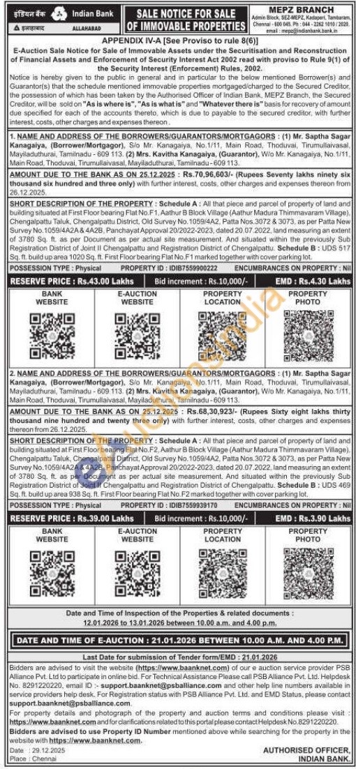 SHORT DESCRIPTION OF THE PROPERTY: Schedule A: All that piece and parcel of property of land and building situated at First Floor bearing Flat No.F2, Aathur B Block Village (Aathur Madura Thimmavaram Village). Chengalpattu Taluk, Chengalpattu District, Old Survey No. 1059/4A2, Patta Nos. 3072 & 3073, as per Patta New Survey No. 1059/4A2A & 4A2B, Panchayat Approval 20/2022-2023, dated 20.07.2022, land measuring an extent of 3780 Sq. ft. as per Document as per actual site measurement. And situated within the previously Sub Registration District of Joint II Chengalpattu and Registration District of Chengalpattu. Schedule B: UDS 469 Sq. ft. build up area 938 Sq. ft. First Floor bearing Flat No.F2 marked together with cover parking lot