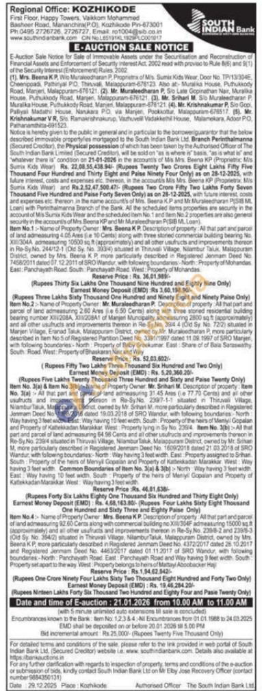 : All that part and parcel of land admeasuring 4.05 Ares e 10 Cents) along with three storied commercial building bearing No. X304A admeasuring 10500 sq ft (approximately) and all other usufructs and improvements thereon in Re-Sy No. 244/12-1 (Old Sy. No. 3934) situated in Thiruvali Village, Nambur Talk, Malappuram District, owned by Mrs. Beena KP more paricularly described in Registered Jenmam Deed No 7458/2011 dated 07.12.2011 of SRO Wandur, with following boundaries: North Property of Mohandas East: Panchayath Road South Panchayath Road West: Property of Mohandas