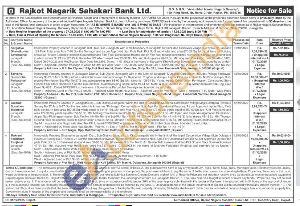 1)Immovable Property situated in Junagadh Dist., Sub Dist. Junagadh, with in the boundary of Junagadh City included Timbavadi Village Survey No.82 Paiki and 129 Paiki Total area Acre 7-10 Guntha Non-agn land as per Approved plan Plots Paiki Plot No.3 and 4 total land area 870-27 Sq. Mtr. and there on Building known as "Shubh Complex in which Ground floor and First Floor Constructed Rooms and on First floor terrace constructed rooms which known as second floor in which rooms No 211 to 226 Plaiks Room No.221 which carpet area 22-36 Sq. Mtr. and Built-up area 26-83 Sq. Mtr. acquired Vide Regd. Sale Deed No. 5123. Dated 06-07-2022 and Modification Sale Deed No.5290, Dated 14-07-2022 in the Name of Kargatiya Dhavalkumar Savdasbhai and bounded by as under North Adjoined Common Passage in which Shutter of Room South-25-00 feet wide Road East: Adjoined Shop No. 220 West: Adjoined Shop No. 222 Property Address:-R.S. No.82p and 129p. Plot No-3 And 4. Shubh Complex, Shop No. 221, Near Timbavadi Gate, Junagadh 362001 (Gujarat)