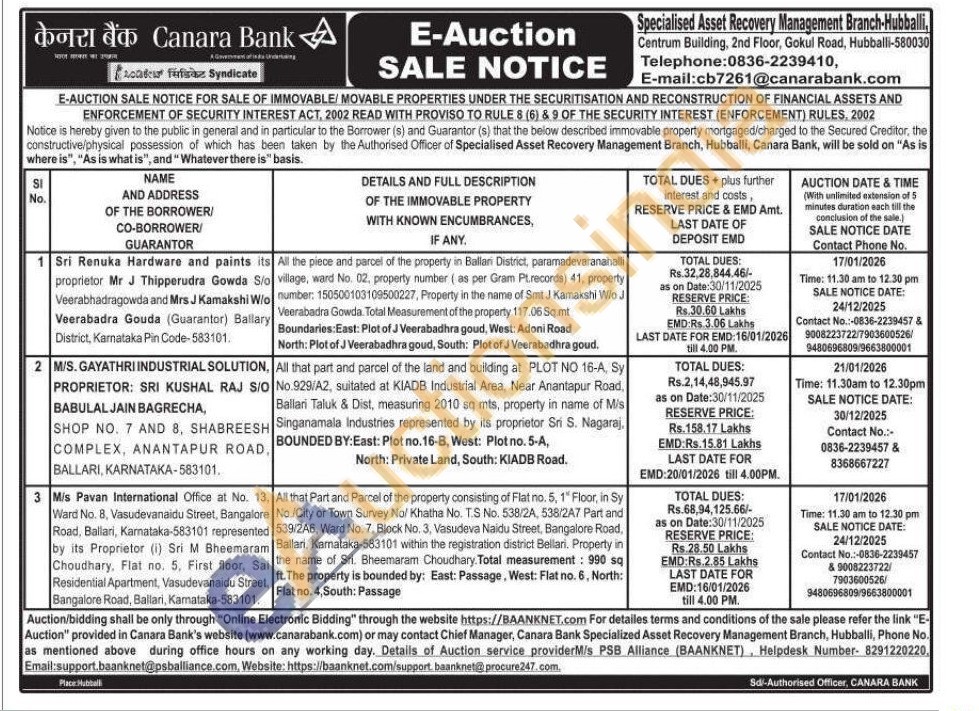 2) All that part and parcel of the land and building at PLOT NO 16-A, Sy No.929/A2, suitated at KIADB Industrial Area, Near Anantapur Road, Ballari Taluk & Dist, measuring 2010 sq mts, property in name of Mis Singanamala Industries represented by its proprietor Sri S. Nagaraj, BOUNDED BY: East: Plot no. 16-B, West: Plot no. 5-A, North: Private Land, South: KIADB Road.