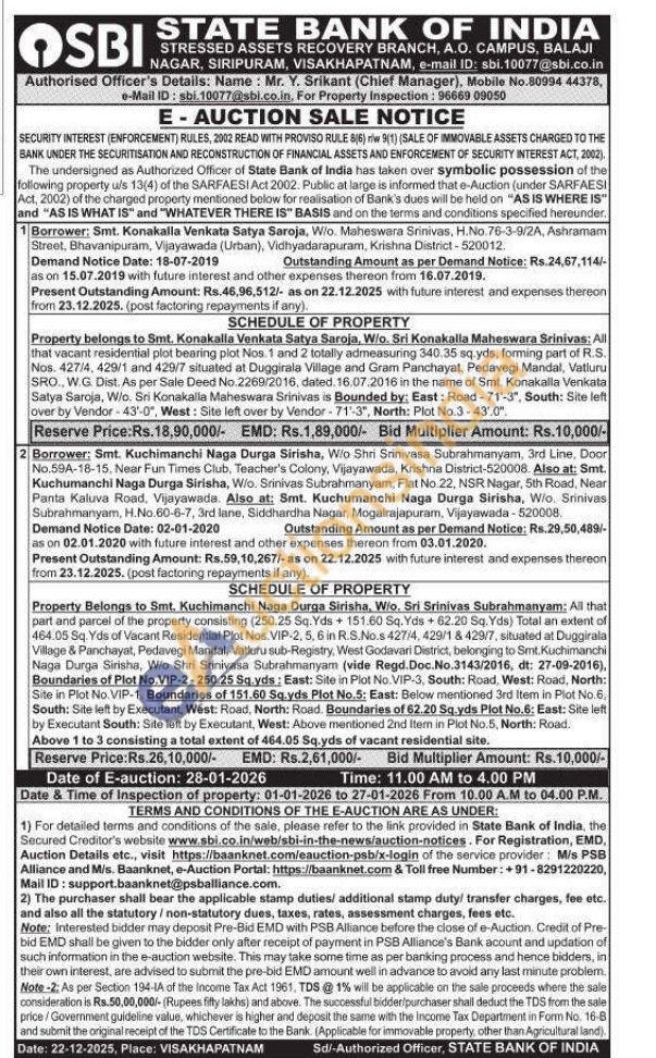 All that part and parcel of the property consisting (250.25 Sq. Yds + 151.60 Sq. Yds + 62.20 Sq. Yds) Total an extent of 464.05 Sq. Yds of Vacant Residential Plot Nos. VIP-2, 5, 6 in R.S.No.s 427/4, 429/1 & 429/7, situated at Duggirala Village & Panchayat, Pedavegi Mandal, Vatluru sub-Registry, West Godavari District, belonging to Smt. Kuchimanchi Naga Durga Sirisha, W/o Shri Srinivasa Subrahmanyam (vide Regd.Doc.No.3143/2016, dt: 27-09-2016), Boundaries of Plot No.VIP-2-250.25 Sq.yds: East: Site in Plot No.VIP-3, South: Road, West: Road, North: Site in Plot No. VIP-1. Boundaries of 151.60 Sq.yds Plot No.5: East: Below mentioned 3rd Item in Plot No.6. South: Site left by Executant, West: Road, North: Road. Boundaries of 62.20 Sq.yds Plot No.6: East: Site left by Executant South: Site left by Executant, West: Above mentioned 2nd Item in Plot No.5, North: Road. Above 1 to 3 consisting a total extent of 464.05 Sq.yds of vacant residential site.