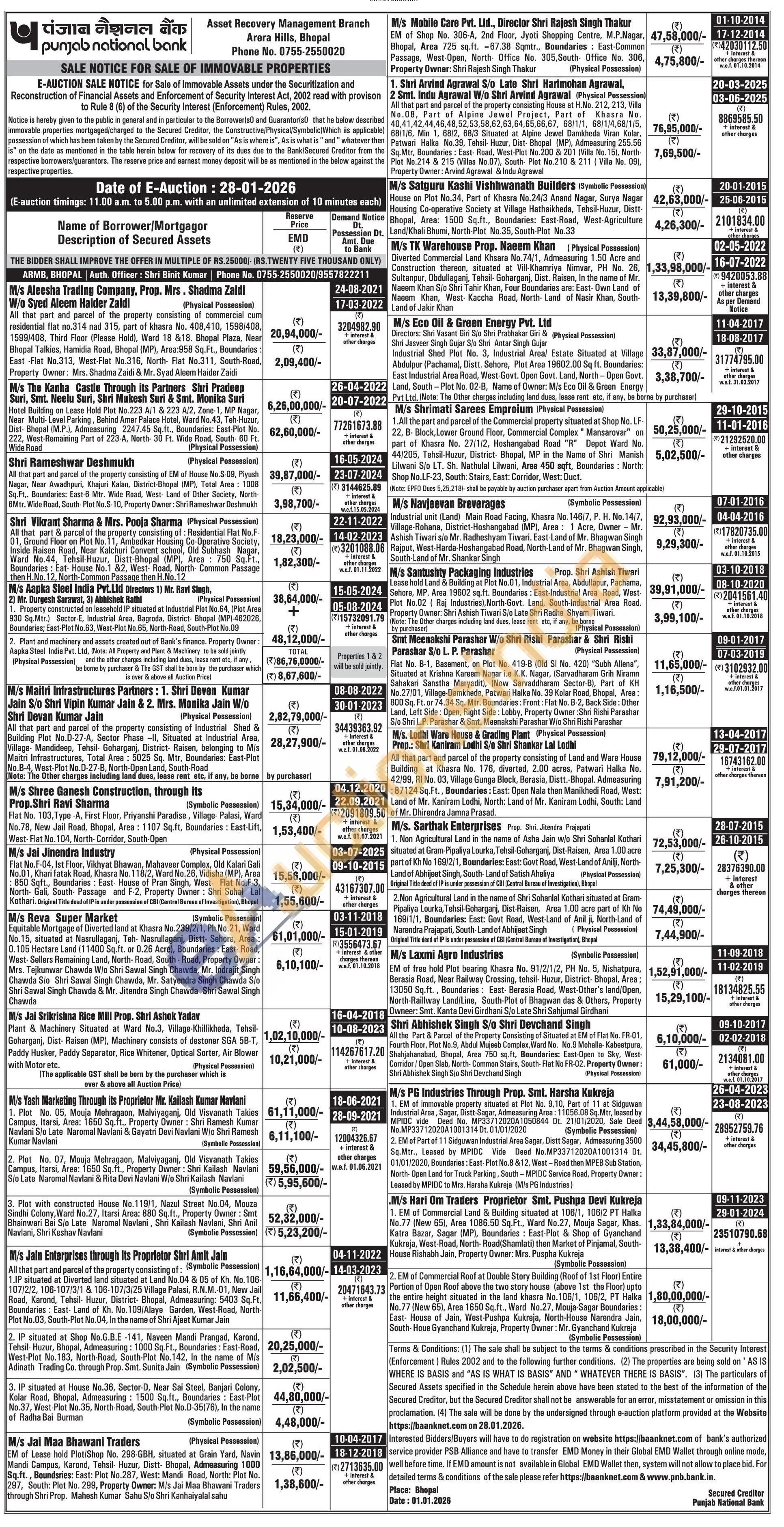 1. EM of immovable property situated at Plot No. 9,10, Part of 11 at Sidguwan Industrial Area, Sagar, Distt-Sagar, Admeasuring Area: 11056.08 Sq.Mtr, leased by MPIDC vide Deed No. MP33712020A1050844 Dt. 21/01/2020, Sale Deed No. MP33712020A1001314 Dt. 01/01/2020 (Symbolic Possession)