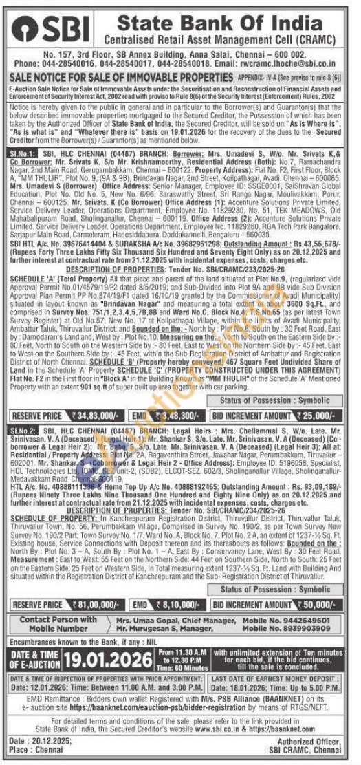 SCHEDULE OF PROPERTY: In Kancheepuram Registrabon District, Thiruvallur District, Thiruvallur Taluk Thiruvallur Town, No. 56, Perumbakkam Village, Comprised in Survey No. 190/2, as per Town Survey New Survey No. 190/2 Part, Town Survey No. 1/7, Ward No. A, Block No. 7. Plot No. 2 A, an extent of 1237-1% Sq. Ft. Existing house, Service Connections with Deposit thereon and its thereabouts as follows. Bounded on the North By: Plot No. 3-A. South By: Plot No. 1-A, East By: Conservancy Lane, West By : 30 Feet Road. Measurement: East to West: 55 Feet on the Northern Side: 44 Feet on Southern Side, North to South: 25 Feet on the Eastern Side: 25 Feet on Western Side, In Total measuring extent 1237-% Sq. Ft. Land with Building And situated within the Registration District of Kancheepuram and the Sub-Registration District of Thiruvallur