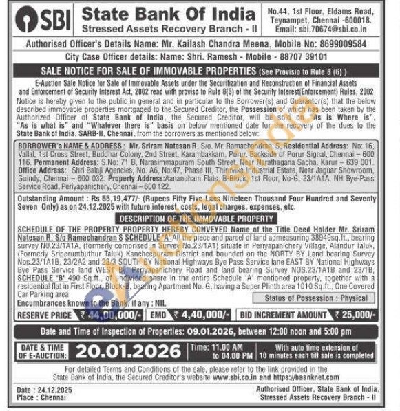 SCHEDULE OF THE PROPERTY PROPERTY HEREBY CONVEYED Name of the Title Deed Holder Mr. Sriram Natesan R. S/o Ramachandran S SCHEDULE 'A' All the piece and parcel of land admeasuring 38949sq. ft., bearing survey NO.23/1A1A, (formerly comprised in Survey No.23/1A1) situate in Periyapanichery Village, Alandur Taluk, (Formerly Sriperumbuthur Taluk) Kancheepuram District and bounded on the NORTY BY Land bearing Survey Nos.23/1A1B, 23/2A2 and 23/3 SOUTH BY National Highways Bye Pass Service lane EAST BY National Highways Bye Pass Service land WEST By, Periyapanichery Road and land bearing Survey NOS.23/1A18 and 23/18, SCHEDULE 'B' 490 Sq.ft, of undivided share in the entire Schedule A' mentioned property, together with a residential flat in First Floor, Block-B, bearing Apartment No. G, having a Super Plinth area 1010 Sq.ft., One Covered Car Parking area
