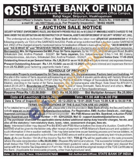 Immovable Property mortgaged by Sri Tarra Jayaram, S/o. Suryanarayana: Factory land and building: All the site in the name of Tarra Jayaram admeasuring an area of 2226.4 square yards along with factory Shed and RCC building covered by R.S.No. 117/27 (Old No. 753/3) of Budithi Village of Saravakota Mandal, Srikakulam District, standing in the name of Sri Tarra Jayaram, S/o. Suryanarayana vide Regd. Sale Deed No. 874/2013, dated.28.05.2013. Boundaries of Property: East: Land of Vana Simhadri, Tarra Anand and others, West: Land of Konu Appanna and others, South: Road, North: Land of Tarra Appalaramayya