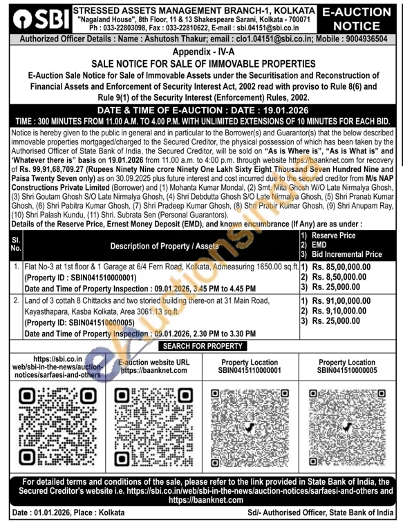 Flat No-3 at 1st floor & 1 Garage at 6/4 Fern Road, Kolkata, Admeasuring 1650.00 sq.ft. (Property ID: SBIN041510000001)