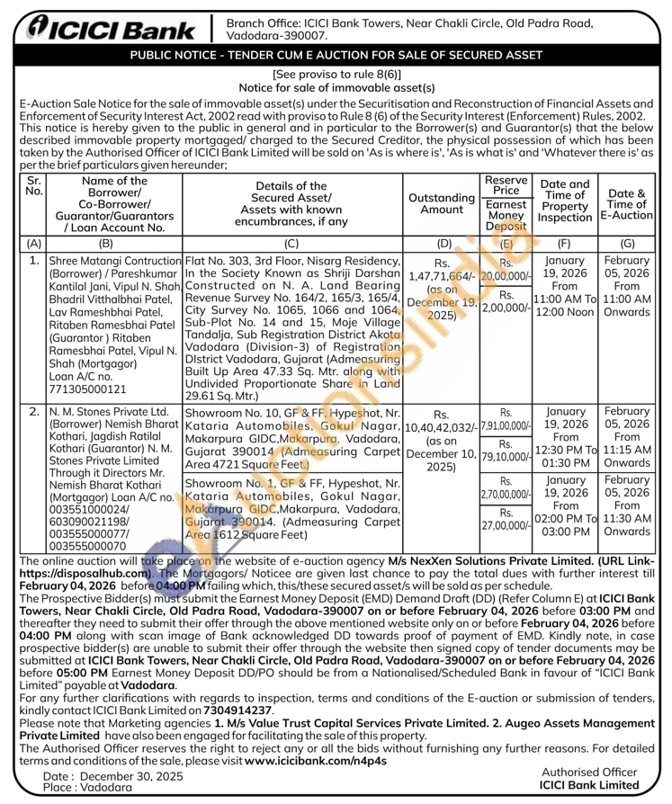 Flat No. 303, 3rd Floor, Nisarg Residency, In the Society Known as Shriji Darshan Constructed on N. A. Land Bearing Riteur 10654106665/3 1664 City Survey No. and Sub-Plot No. 14 and 15, Moje Village Tandalja, Sub Registration District Akota Vadodara (Division-3) of Registration District Vadodara, Gujarat (Admeasuring Built Up Area 47.33 Sq. Mtr. along with Undivided Proportionate Share in Land 29.61 Sq. Mtr.)