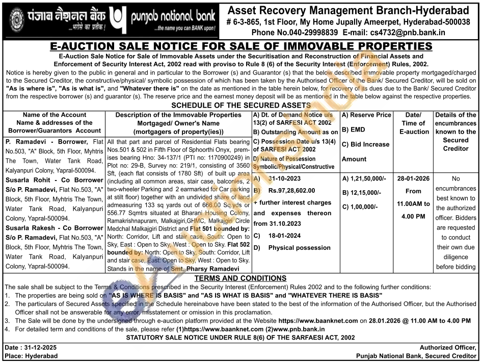 All that part and parcel of Residential Flats bearing Nos.501 & 502 in Fifth Floor of Sphoorthi Onyx, prem-ises bearing Hno: 34-137/1 (PTI no: 1170900249) in Plot no: 29-B, Survey no: 219/1, consisting of 3560 Sft, (each flat consists of 1780 Sft) of built up area (including all common areas, stair case, balconies, 2 two-wheeler Parking and 2 earmarked for Car parking at stilt floor) together with an undivided share of land admeasuring 133 sq yards out of 666.00 Sq.yds or 556.77 Sqmtrs situated at Bharani Housing Colony, Ramakrishnapuram, Malkajgiri, GHMC, Malkajgiri Circle Medchal Malkajgiri District and Flat 501 bounded by: North: Corridor, Lift and stair case, South: Open to Sky, East: Open to Sky, West: Open to Sky, Flat 502 bounded by: North: Open to Sky, South: Corridor, Lift and stair case, East: Open to Sky, West: Open to Sky. Stands in the name of Smt. Pharsy Ramadevi.