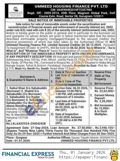 All that part and parcel of Residential Plot Having Admeasuring Area 100 Sq. Yrds. Which Jointly Parts Of 75 Sq. Ft Of Plot No. 197 & 25 Sq. Yards. Of Plot No. 196, Comrised In Khasra No. 3/22(8-0), Situated In Waka Mouja Nangla Gujran, Tehsil & District- Faridabad, Haryana, Bounded As East-Plot No-214 &215, Wast-Na, North-Na, South-Road Wide 15 Feet.