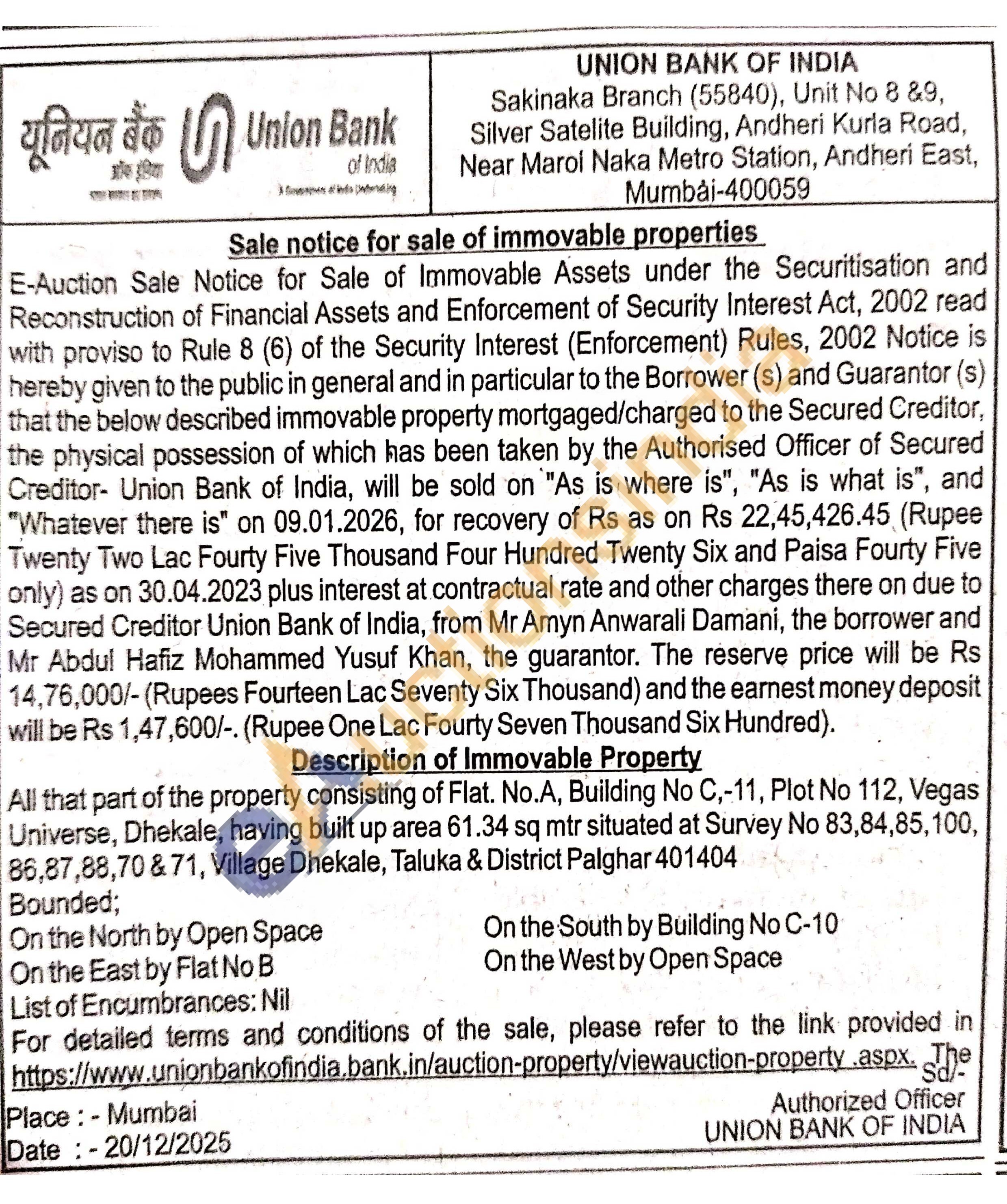 All that part of the property consisting of Flat. No.A, Building No C,-11, Plot No 112, Vegas Universe, Dhekale, having built up area 61.34 sq mtr situated at Survey No 83,84,85,100, 86,87,88,70 & 71, Village Dhekale, Taluka & District Palghar 401404 Bounded; On the North by Open Space On the East by Flat No B On the South by Building No C-10 List of Encumbrances: Nil On the West by Open Space