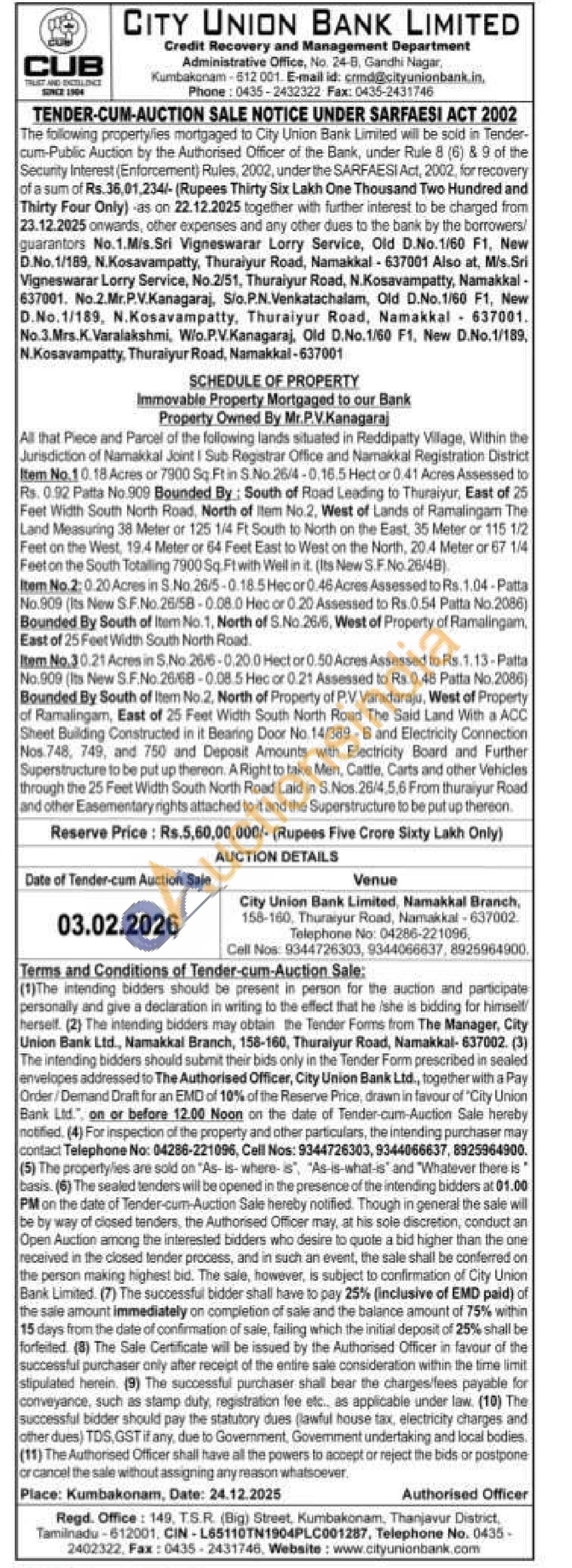 All that Plece and Parcel of the following lands situated in Reddipatty Village, Within the Junsdiction of Namakkal Joint Sub Registrar Office and Namakkal Registration District Item No.10.18 Acres or 7900 Sq Ftin S.No 264-0.16.5 Hect or 0.41 Acres Assessed to Rs. 0.92 Patta No.909 Bounded By: South of Road Leading to Thuraiyur, East of 25 Feet Width South North Road, North of Item No.2. West of Lands of Ramalingam The Land Measuring 38 Meter or 125 1/4 Ft South to North on the East, 35 Meter or 115 1/2 Feet on the West, 19.4 Meter or 64 Feet East to West on the North, 20.4 Meter or 67 1/4 Feet on the South Totalling 7900 Sq. Ft with Well in it. (Its New S.F.No 26/48). Item No.2: 0.20 Acres in S.No 26/5-0.18.5 Meccr0.46. Acres Assessed to Rs.1.04-Patta No.909 (Its New S.F.No.26/58-008.0 Hec or 0.20 Assessed to Rs. 0.54 Patta No.2086) Bounded By South of Item No. 1, North of S.No 26/6, West of Property of Ramalingam East of 25 Feet Width South North Road Item No.30.21 Acres in S.No 26/6-0.20.0 Hector 0.50 Acres Assessed to Rs.1.13-Patta No 900 (Its New S.F.No.2658-0.08.5 Hec or 0.21 Assessed to Rs. 0.48 Patta No.2006) Bounded By South of Item No.2. North of Property of P.V. Varadaraju, West of Property of Ramalingam, East of 25 Feet Width South North Road The Said Land With a ACC Sheet Buliding Constructed in it Beaning Door No. 14/389-B and Electricity Connection Nos 748, 749, and 750 and Deposit Amounts with Electricity Board and Further Superstructure to be put up thereon: A Right to take Men, Cattle, Carts and other Vehicles through the 25 Feet Width South North Road Lald in 5.Nos. 264,5,6 From thuraiyur Road and other Easementary rights attached to it and the Superstructure to be put up thereon.