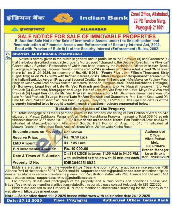 Equitable Mortgage of all that is part and parcel of the property consisting of Part Portion of Arazi no 543 situated at Mauza Dabhaon, Pargana-Arail, Tehsil Karchhana Pragyraj measuring Total 338.16 sq mtr vide sale deed no 3887 dated 10.10.2002 Boundaries as per deed: North: Part Portion of Arazi no 543 mi situated at Mauza-Dabhaon Allahabad South: Part Portion of Arazi no 543 mi situated at Mauza-Dabhaon Allahabad East: Arazi of others West: 20 feet wide Kacha Rasta