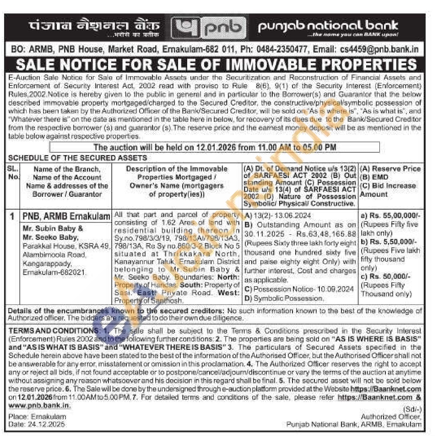 All that part and parcel of property consisting of 1.62 Ares of land with residential building thereon in Sy.no.798/3/3/19, 798/13A1/796/13A3, 798/13A, Re Sy no.860/3-2 Block No 5 situated at Thrikkakara North, Kanayannur Taluk, Ernakulam District belonging to Mr. Subin Baby & Mr. Seeko Baby. Boundaries: North: Broperty of Haridas South: Property of Property of Santhosh.