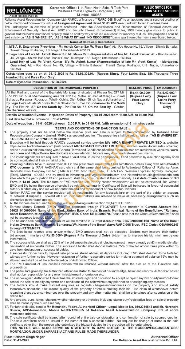 All that Part and parcel of the Equitable Mortgage of situated at Khasra No. 217 Min (Pvt Plot No. 56 & 55) measuring area 138.011 Sq. Metre, situated at Village-Shimla Bahadur, Pargana- Rudrapur, Tehsil Kichha, Dist- Udham Singh Nagar (Uttarakhand) by Legal Heirs of Late Mr. Vivek Kumar S/o Ashok Kumar. Boundaries-On The North by Pvt Plot No. 57. On the South by Pvt Plot No. 57. On the East by Garden, On the West-Rasta.