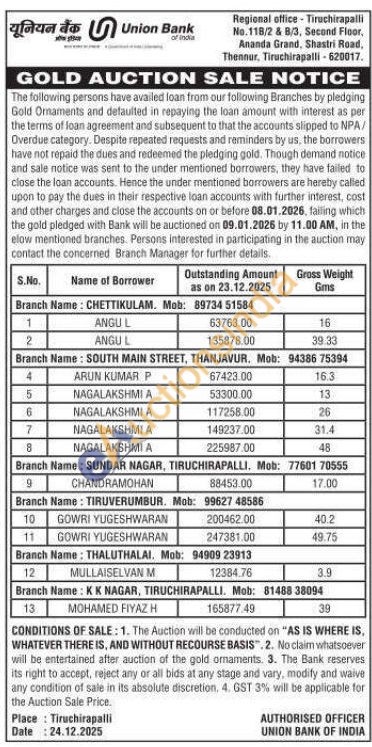 Union Bank of India Gold Auctions Auction in Tiruchirappalli