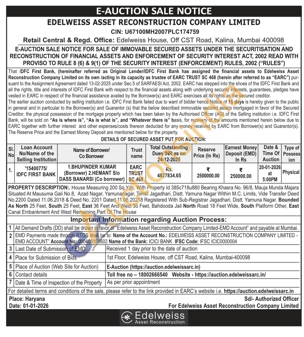 PROPERTY DESCRIPTION:. House Measuring 200 Sq. Yds. With Property Id 385c718u880 Bearing Khasra No. 96/8, Mauja Munda Majara Situated At Mausuma Gali No.8, Azad Nagar, Yamunanagar, Tehsil Jagadhari, Distt. Yamuna Nagar Within M.C. Limits, Vide Transfer Deed No.2200 Dated 11.06.2018 & Deed No. 2201 Dated 11.06.20218 Registered With Sub-Registrar Jagadhari, Distt. Yamuna Nagar. Bounded As North 25 Feet, South 25 Feet, East 36 Feet And West 36 Feet, Bahdooda Jail North Road 18 Feet Wide, South Platform Other, East Canal Embankment And West Remaining Part Of The House