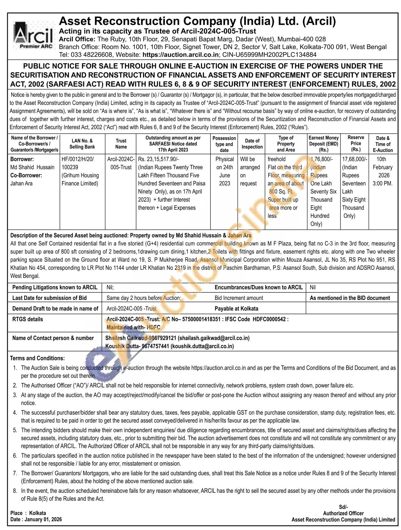 Description of the Secured Asset being auctioned: Property owned by Md Shahid Hussain & Jahan Ara All that one Self Contained residential flat in a five storied (G+4) residential cum commercial building known as MF Plaza, being flat no C-3 in the 3rd floor, measuring super built up area of 800 sft consisting of 2 bedrooms, 1drawing cum dining, 1 kitchen, 2 Toilets with fittings and fixture, easement rights etc. along with one Two wheeler parking space Situated on the Ground floor at Ward no 19, S. P Mukherjee Road, Asansol Municipal Corporation within Mouza Asansol, JL No 35, RS Plot No 951, RS. Khatian No 454, corresponding to LR Plot No 1144 under LR Khatian No 2319 in the district of Paschim Bardhaman, P.S: Asansol South, Sub division and ADSRO Asansol, West Bengal,