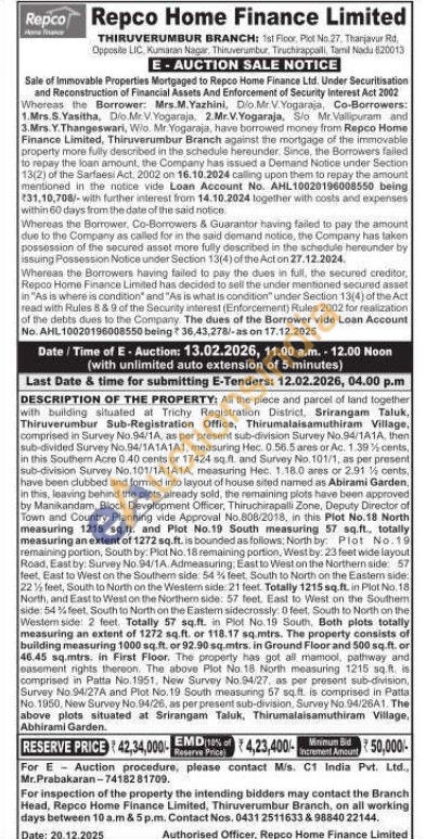 DESCRIPTION OF THE PROPERTY: All the piece and parcel of tand together with building situated at Trichy Registration District, Srirangam Taluk, Thiruverumbur Sub-Registration Office, Thirumalaisamuthiram Village, comprised in Survey No.94/1A, as per present sub-division Survey No.94/1A1A, then sub-divided Survey No.94/1A1A1A1, measuring Hec. 0.56.5 ares or Ac. 1.39% cents, in this Southern Acre 0-40 cents or 17424 sq.ft. and Survey No. 101/1, as per present sub-division Survey No. 101/1A1A1A, measuring Hec. 1 18.0 ares or 2.91 cents, have been clubbed and formed into layout of house sited named as Abirami Garden, in this, leaving behind the plots already sold, the remaining plots have been approved by Manikandam, Block Development Officer, Thiruchirapalli Zone, Deputy Director at Town and Country Planning vide Approval No.808/2018, in this Plot No.18 North measuring 1215 sq.ft. and Plot No.19 South measuring 57 sq.ft., totally measuring an extent of 1272 sq.ft. is bounded as follows: North by: Plot No.19 remaining portion, South by: Plot No.18 remaining portion, West by: 23 feet wide layout Road, East by: Survey No. 94/1A. Admeasuring, East to West on the Northern side: 57 feet, East to West on the Southem side: 54 % feet, South to North on the Eastern side: 22% feet, South to North on the Western side: 21 feet. Totally 1215 sq.ft. in Plot No. 18 North, and East to West on the Northern side: 57 feet. East to West on the Southem side: 54% feet, South to North on the Eastem sidecrossly: 0 feet, South to North on the Western side 2 feet. Totally 57 sq.ft. in Plot No. 19 South, Both plots totally measuring an extent of 1272 sq.ft. or 118.17 sq.mtrs. The property consists of building measuring 1000 sq.ft. or 92.90 sq.mtrs. in Ground Floor and 500 sq.ft. or 46.45 sq.mtrs. in First Floor. The property has got all mamool, pathway and easement rights thereon. The above Plot No.18 North measuring 1215 sq.ft. is comprised in Patta No. 1951, New Survey No.94/27, as per present sub-division, Survey No 94/27A and Plot No. 19 South measuring 57 sq.ft. is comprised in Patta No. 1950, New Survey No. 94/26, as per present sub-division, Survey No. 94/26A1. The above plots situated at Srirangam Taluk, Thirumalaisamuthiram Village, Abhirami Garden.