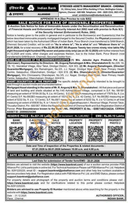 : All that piece and parcel of land and building and sheds situated at No.1/45 Azhinjivakkam Village, comprised in S.F. No. 68/181 measuring an extent of 19184.00 Sq. ft. (i.e. 44 Cents), S.F. No. 68/2A measuring an extent of 17876 Sq. ft. (i.e. 41 Cents) S.F. No.68/283 measuring an extent of 18312 Sq. ft. (ie. 42 Cents), S.F. No.68/282 measuring an extent of 5232 Sq. ft. (ie. 12 Cents), S.F. No.68/1 measuring an extent of 5232 Sq. ft. (Le 12 Cents) in all total measuring an extent of 65836 Sq. ft. or 1 Acre 51 Cents in Jaganathapuram-1, Revenue Village, Ponneri Taluk, Tiruvallur District, Pin-600067 Within the Registration District of Chennai North and Sub Registration District of Ponner. Prior Encumbrance known to the Bank: NIL