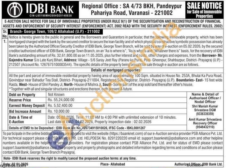All the part and parcel of immovable residential property having area of approximately 100 Sqm, situated in House No. 253A, Bhulai Ka Pura Road, Govindpur near Bahadur Tea Stall, District-Prayagraj-211004, Registered Sub-Registrar, District- Prayagraj (U.P.). Boundaries-East-15 feet wide Rasta, West-House of Shri Pandey Ji, North-House of Mishra Ji, South-Some part of the araji sold land thereafter other's house.