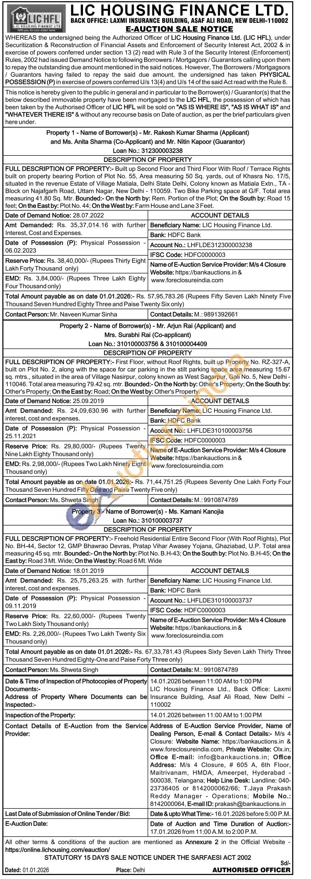 FULL DESCRIPTION OF PROPERTY:- First Floor, without Roof Rights, built up Property No. RZ-327-A, built on Plot No. 2, along with the space for car parking in the stilt parking space area measuring 15.67 sq. mtrs., situated in the area of Village Nasirpur, colony known as West Sagarpur, Gali No. 5, New Delhi -110046. Total area measuring 79.42 sq. mtr. Bounded:- On the North by: Other's Property; On the South by: Other's Property; On the East by: Road; On the West by: Other's Property.
