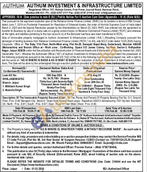 Description Of The Immovable Property Secured Asset: All The Pieces And Parcels Of Property Bearing Flat No. G-1 Ground Floor, Pro. D-82 Manglam City Block-D Gram-Hatoj Kalwar Road Jaipur Rajasthan-302012 Admeasuring 1031 Sq.feet. Bounded On: North: P.no. D-81 South: P.no. D-57 | East: Road 40 Feet Wide West: Pna. D-83.