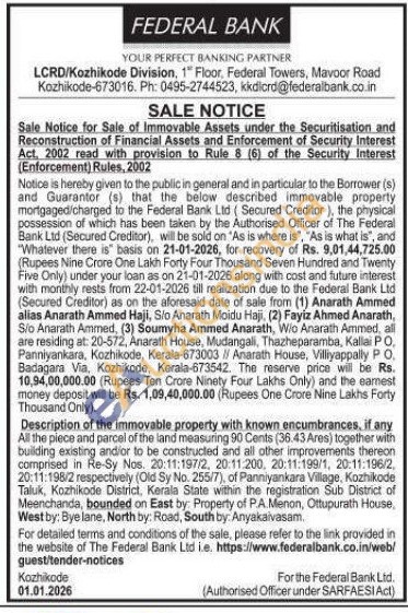 Description of the immovable property with known encumbrances, if any All the piece and parcel of the land measuring 90 Cents (36.43 Ares) together with building existing andior to be constructed and all other improvements thereon comprised in Re-Sy Nos. 20:11:197/2, 20:11:200, 20:11:199/1, 20:11:196/2, 20:11:198/2 respectively (Old Sy No. 255/7), of Panniyankara Village, Kozhikode Taluk, Kozhikode District, Kerala State within the registration Sub District of Meenchanda, bounded on East by Property of P.A.Menon, Ottupurath House, West by: Bye lane, North by: Road, South by:Anyakaivasam