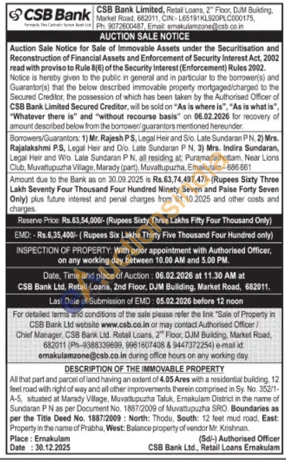 DESCRIPTION OF THE IMMOVABLE PROPERTY : All that part and parcel of land having an extent of 4.05 Ares with a residential building, 12 feet road with right of way and all other improvements therein comprised in Sy. No. 352/1-A-5, situated at Marady Village, Muvattupuzha Taluk, Emakulam District in the name of Sundaran P N as per Document No. 1887/2009 of Muvattupuzha SRO. Boundaries as per the Title Deed No. 1887/2009: North: Thodu, South: 12 feet mud road, East: Property in the name of Prabha, West: Balance property of vendor Mr. Krishnan