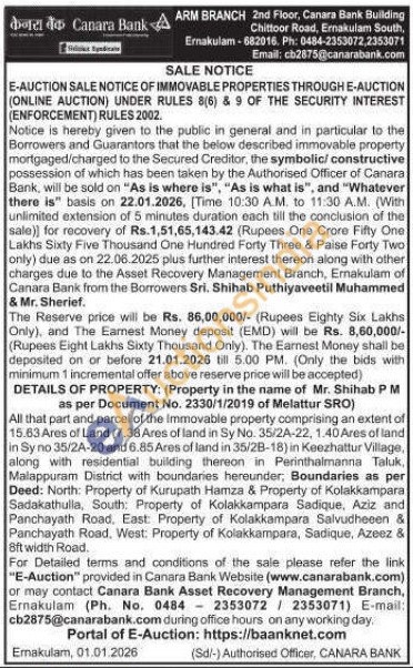 DETAILS OF PROPERTY: (Property in the name of Mr. Shihab PM as per Document No. 2330/1/2019 of Melattur SRO) : All that part and parcel of the Immovable property comprising an extent of 15.63 Ares of Land (7.38 Ares of land in Sy No. 35/2A-22, 1.40 Ares of land in Sy no 35/2A-20 and 6.85 Ares of land in 35/28-18) in Keezhattur Village, along with residential building thereon in Perinthalmanna Taluk, Malappuram District with boundaries hereunder, Boundaries as per Deed: North: Property of Kurupath Hamza & Property of Kolakkampara Sadakathulla, South: Property of Kolakkampara Sadique, Aziz and Panchayath Road. East: Property of Kolakkampara Salvudheeen & Panchayath Road, West: Property of Kolakkampara, Sadique, Azeez & 8ft width Road